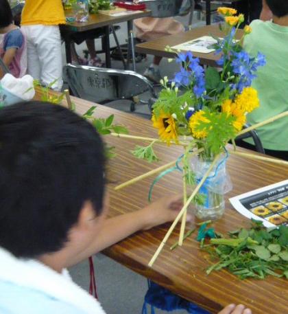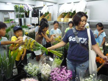 卒業生の保護者の方が働く市場のお店に招いていただきました。そこで、卸の仕組みを実際に取り引きされている花を見て学んだり、セリをしている場所に実際に座らせていただいたり、雰囲気を味わいました。その後、部屋へ移動して、花を使ってフラワーアレンジメント(?)に挑戦しました。まず、花器をペットボトルで思い思いの形に切って作りました。つぎに、たくさん用意された花から好きな組み合わせで選びます。その前に、花の特徴を教えていただいたり、花や葉のにおいを一つ一つ確かめたりもしました。いよいよ花を生けていきますが、意外と男の子が夢中になっていて、独創的で大胆な作品をつくっていました。