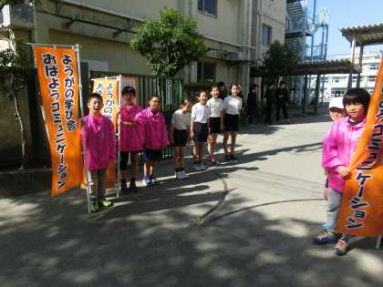 快晴の中、3校合同でおはようコミュニケーションを行いました。今日も元気なあいさつが響きました。