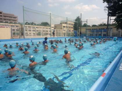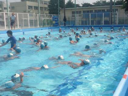 後期水泳教委室3日目、今日も快晴です。プールサイドの気温は35度を超える猛暑が続いていますが、水の青さが目にしみるプールは、水泳には快適です。