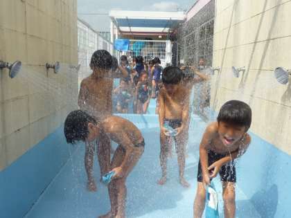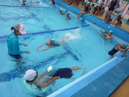 用賀小学校の水泳教室には自由に泳ぐ時間はありません。遊びに来るのではなく、みんな級別に分かれて目標に向かって一生懸命練習します。ですから、目標を達成した時の喜びが大きいのです。