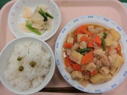 今日は、今が旬のグリンピースを使って、「グリンピースごはん」を炊きました。そこで今日は、「グリンピース」のクイズを出したいと思います。グリンピースにたくさん入っている、おなかの中をきれいにそうじしてくれる栄養素は、次のうちのどれでしょうか?