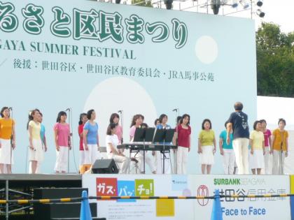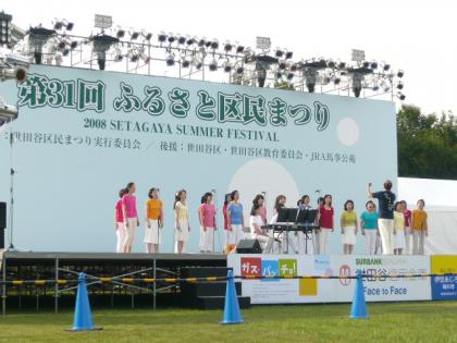 2日(土)馬事公苑で、ふるさと区民まつりが開催されました。その屋外仮設舞台で、「ラララようが」も大きくかかわっている「みつる合唱団」の演奏がありました。この日もとっても暑い日で、少し日が傾き始めた頃に歌い始めました。屋外ですので、マイクやスピーカーも使います。曲目は、「蕾つぼみ」「サボテンの花」「ジュピター」などポップスを中心にきく人たちが喜ぶ選曲でした。広い芝生の会場でしたが、隅々まで若々しい声が響き渡りました。