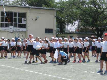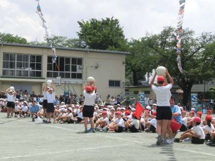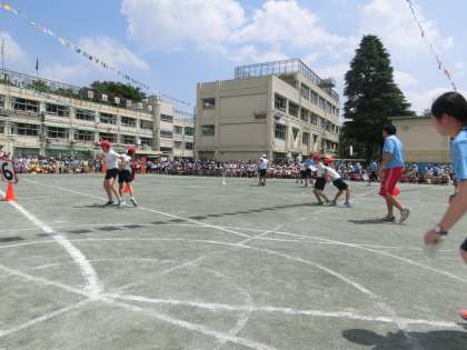 創立60周年記念運動会 (8)5年 「みんなでつなげ 用賀玉」 公開日 2017/05/27 更新日 2017/05/27 今日のできごと 5年生の団体競技は、2人が背中合わせで、用賀小学校の大切な玉である、全力玉、勇気玉などを運びました。 みんなが協力して玉を運ぶ姿は、とても微笑ましかったです。