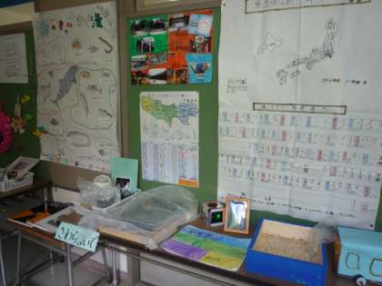 廊下には3年4組の夏休みの作品がいち早く掲示してありました。これから、どの学級にも力作が飾られますので、保護者会の折にご覧ください。