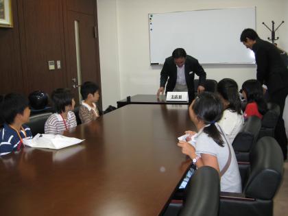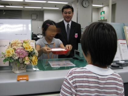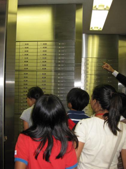 次に銀行の各フロアーを見学しました。支店長室に入ったり、貸金庫室を見学させてもらいました。最後にカウンターにすわって銀行のお金を預かって通帳に記入する模擬体験を