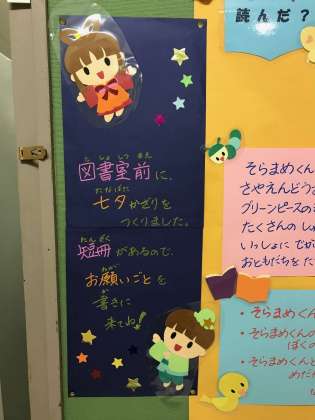 図書室前の飾りに短冊が貼れるようになっているので、自分の願い事を書いてみてください!