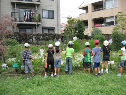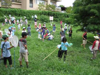 緑の草が一面に生えた空き地で、いよいよ虫取り開始です!