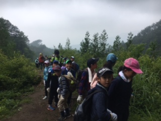 やっほ 公開日 2017/06/27 更新日 2017/06/27 学年 弱音を吐きつつも、本日のめあて「前の人の後ろをきちんと整列する」ことを頑張っています。木の根っこを掴み、足場を探し。あと500mで頂上です。