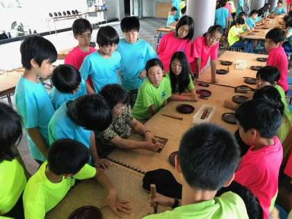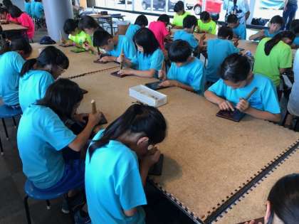日光市にある「木彫りの里」で、日光彫に挑戦しています。ヒッカキ刀を使って、真剣な表情で作品作りに臨んでいます。