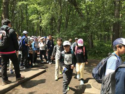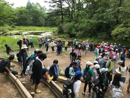 日光林間学園 2 日目(3) 公開日 2017/07/22 更新日 2017/07/22 学年 ハイキングのスタートを竜頭ノ滝で予定していましたが、お天気の心配もあり赤沼に変更しました。昨日のレク大会で、この赤沼という地名の由来もクイズになっていました。 戦場ヶ原を歩いていると、この地域ならではの植物が見られます。友達と励ましあいながら、一歩一歩進んでいます。今泉門池で休憩タイムです。少し疲れた表情ですが、目指すは湯滝のお弁当。もうひと頑張りです。