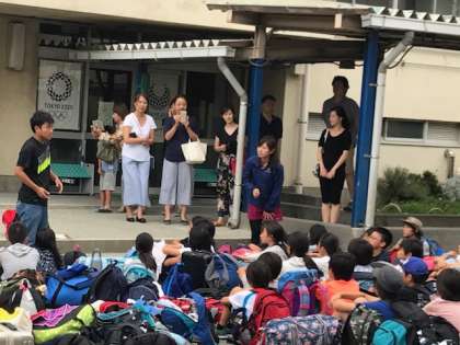 バスの長旅を終え、学校に到着しました。たくさんの保護者の方々、先生方に迎えていただきありがとうございました。子供達もホッとした様子でした。