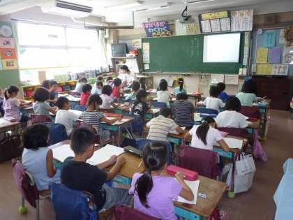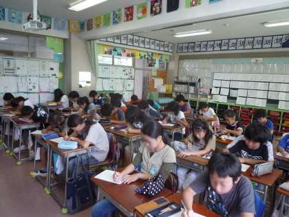 漢字の小テストをしている6年生の教室は鉛筆の滑る音が響きます。