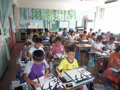 4年生の習字。先生は、姿勢よく筆を立てて!と指導します。