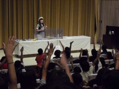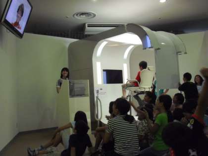 東芝科学館には、東芝創業以来の歩みから、最先端技術まで様々なコーナーがありました。子どもたちに人気だったのはデジタル技術・映像コーナーで、特に「クロマキースタジオ」「デジタルかがみ」では大きな笑いが起こっていました。科学の実験室でも多くの子どもたちが手を挙げ、やる気のあるお子さんたちですねとお誉めの言葉をいただきました。