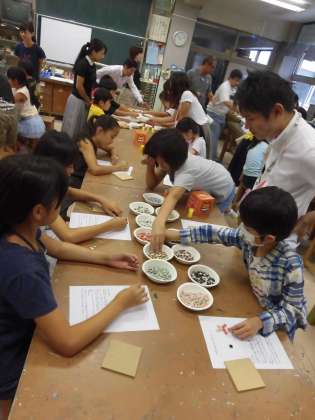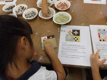 本日図工室にて、講師にLIXIL様をお招きし、「タイル鍋敷き作り」が行われました。まずは紙の上にいろいろな色の小さなタイルのかけらを、自分の好きなデザインに並べていきます。デザインが決まったら一つ一つ木の板に貼っていきます。