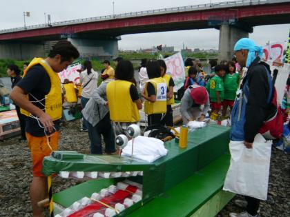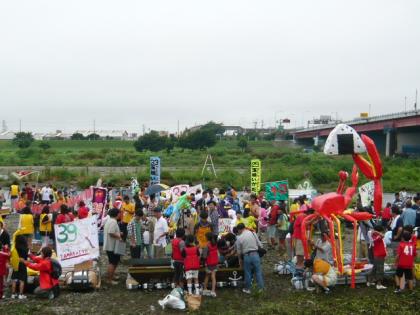 アド多摩の写真集です。中にはユニークないかだも出廷されました。メイドさんに扮したメンバーが漕ぐいかだや、大きなかにが印象的ないかだなどもありました。本校からも発泡スチロールのぎざぎざを生かしたワニですが、なかなかいいでしょう?