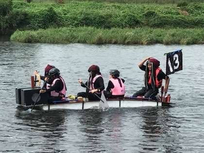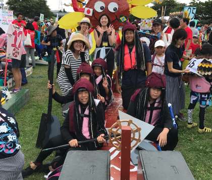 そして今日、夏らしい雲が青空に浮かぶ中、多摩川にスタンバイ!お家の方お手製のジャックスパローグッズを身につけていよいよ出発です!