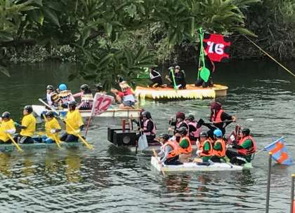 夏休み開始と共に、エイサーや夏季水泳指導に参加しながら作ったスプラッシュ号。昨年あいにくの雨で多摩川下りができなかった先輩達の思いも大切にしながら船造りに臨みました。