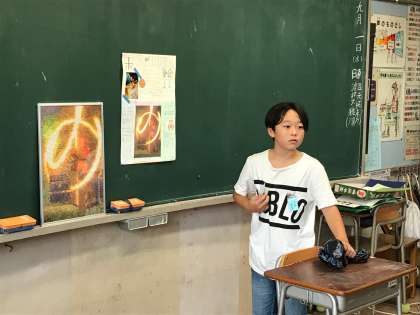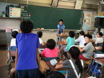 始業式の日、宿題の一つの自由は研究を大事そうに抱え登校してきた子供達。各教室で発表会や作品の見合いが行われています。