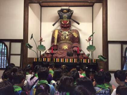 閻魔様の像の前で日頃の「ごめんなさい」を心に念じた後、極楽浄土をイメージした寺の中に足を踏み入れます。普段とは違う雰囲気を感じ取り、静かに話を聞いていました。