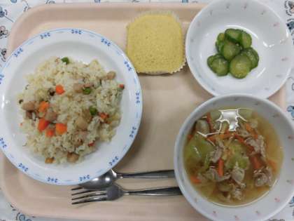 毎月19日は、食育の日です。食育の日には、「給食で世界を飛び回ろう!〜東京オリンピック・パラリンピックに向けて、世界各国の料理に触れよう〜」ということで、いろいろな国の料理を出しています。今日の献立は、「中国」の料理です。クイズです。マーラーカオの「マーラー」とは、中国の言葉で何という意味でしょうか?