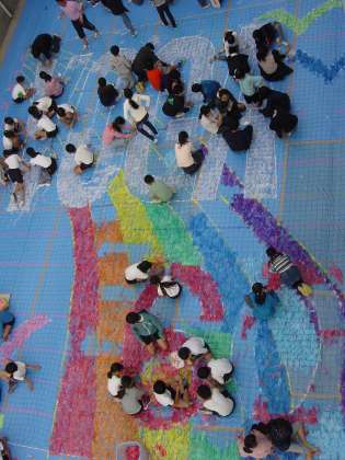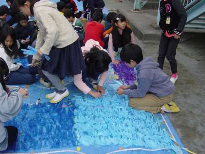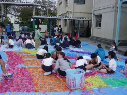 本日5、6年生で、創立60周年記念式典に向けて、スズランテープとネットを使った壁画を制作しました。みんなで心を一つに、スズランテープを一つ一つ結んでいきました。デザインは、5・6年生から募集し、決定しました。式典当日までに、南校舎の壁面に展示されます。