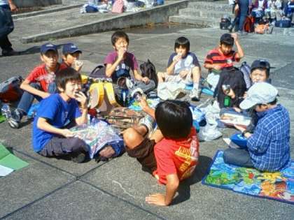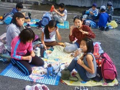 11時30分にはお昼ご飯です。 愛情いっぱいのお弁当を、班のみんなとおいしくいただきました。