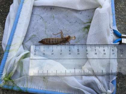 それは、ヤゴの抜け殻です。ヤゴならたくさんいますが、驚いたのはそのサイズです。およそ4センチメートルの大きさでした。ヤンマ系のトンボでしょうか、こんなに大きいヤゴがビオトープに棲みついていたことに、驚きと喜びを感じました。