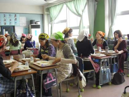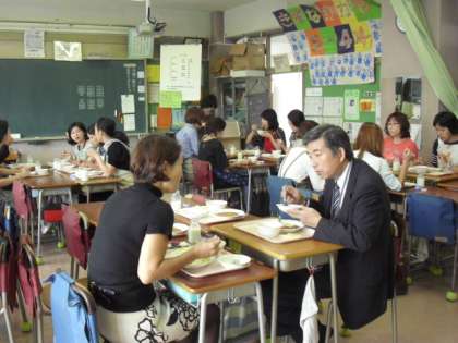 給食試食会では和やかな雰囲気の中で、懐かしい給食当番をしたり、子どものころを思い出しながらおいしい給食をいただきました。