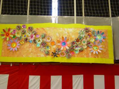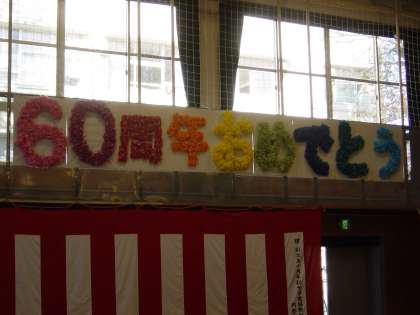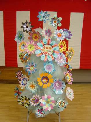 黄色の壁画が、4組です。また、4年生の作成したお花20個が、お花タワーになりました。後方に展示している、「60周年おめでとう」の花文字は、3年生が作成しました。18日の式典に向け、体育館が華やかです。