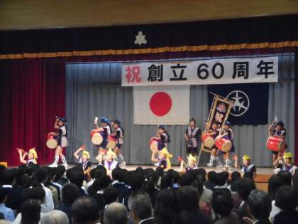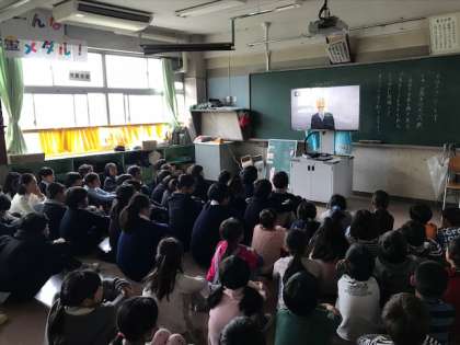 登校するとTV放送がありました。校長先生から今日配布される記念誌をもとにお話しされました。