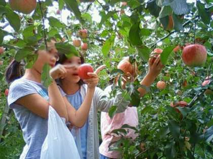 りんご園に到着しました。説明を受けたあと、いよいよりんご狩りです。赤城りんごを一人2個ずつもぎました。上手にもいで、服で拭いてピカピカにしています。赤城りんごを丸かじりさせてもらいました。おいしい!