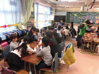 楽しくお話をしながら給食を食べた後は、各クラスで交流の時間を行いました。