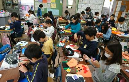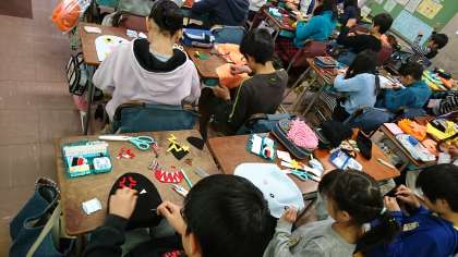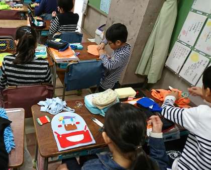 身の回りの整理・整とんやそうじの授業とも関連して、「クリピカ星人」を作っています。”クリーン””ピカピカ”の言葉から名付けました。とても便利なおそうじグッズです。おそうじが大好きなクリピカ星人はが5年生の子どもたちの家にやってくるところから想像をふくらませて、デザインを自分たちで考えました。手ぬいとミシンぬいを両方使って仕上げます。子どもたちは、1・2学期にできるようになったぬい方を生かして取り組んでいます。128体全て異なるクリピカ星人の仕上がりが、とても楽しみです。