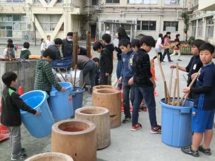 用賀小学校の伝統の一つ「もちつき大会」に向け、5年生が準備をしました。用賀小学校の5年生にとってのもちつき大会は、6年生から仕事を引きつぐ意味があります。