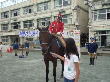 まず、集会委員の代表児童からお礼の言葉、次にお馬さんにインタビューです。