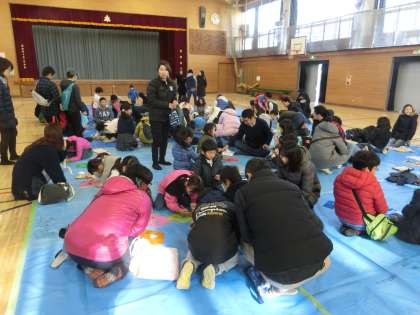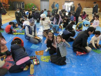凧作りに参加した児童は115名。保護者の方もたくさん参加し、一緒に作ったり、凧あげをしたりしました。