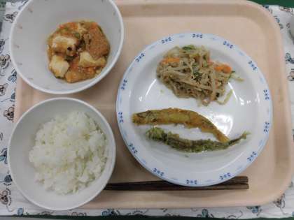 今日の給食には、「ししゃも」という魚を使いました。そこで今日は、「ししゃも」のクイズを出したいと思います。「ししゃも」は、漢字で書くと、ある植物の漢字が入ります。さて、どの植物でしょうか?