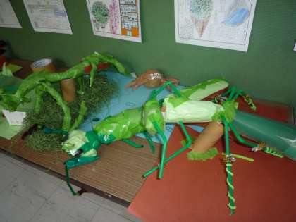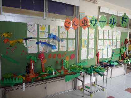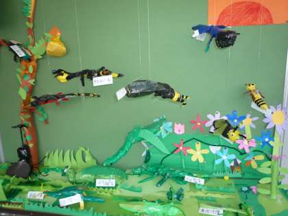 10/15 3年生の昆虫ワールド 公開日 2010/10/15 更新日 2010/10/15 校長室より 3年生の教室前には、各学級ともに昆虫の世界が広がっています。この一カ月、毎日校門挨拶の時に、虫籠を自慢そうに持ってきていた3年生の学習を、昆虫ワールドとして見ることができました。 理科と図工の合科によって時間を生みだし、昆虫の体の仕組みをを考えた模型を作って展示してあります。 今にも動き出しそうな迫力のある作品ばかりです。楽しみながらも子どもたちの目のたしたさに驚かされました。