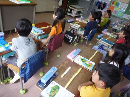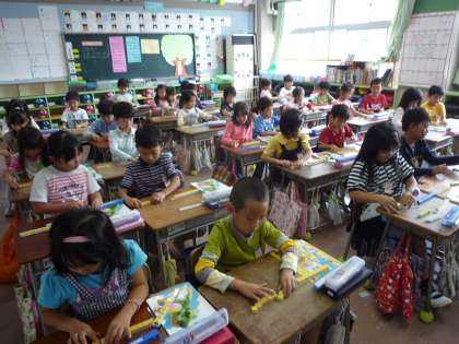 1年生の教室では足し算の勉強をしています。机の上には黄色いブロックが置いてあります。9たす5は・・・実際にブロックを置いてみて考えます。5から一つとって9に着けると10のかたまりが一つできますね!