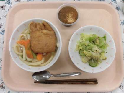 1/11 本日の給食 公開日 2018/01/12 更新日 2018/01/12 給食 〜今日の献立〜 もち入りきつねうどん 牛乳 野菜のゆかり和え 黒蜜寒天 〜給食メモ〜 今日(1月11日)は、ある行事の日です。さて、今日は何の日でしょうか? 1. お正月 2. 七草 3 鏡開き ※クイズのこたえは、「食材がとれたところ…」の最後にのせています。 食材がとれたところ・・・ 閉じる 食材がとれたところ… 鶏肉…青森県 こまつな…東京都 にんじん…千葉県 たまねぎ…北海道 ねぎ…千葉県 キャベツ…愛知県 きゅうり…群馬県 こたえは、3の「鏡開き」です。鏡開きの日には、お正月にお供えしておいた鏡餅を食べ、今年も元気に過ごせるようにと願います。給食では、もち入りきつねうどんを作りました。残さず食べて、今日も元気に過ごしましょう。