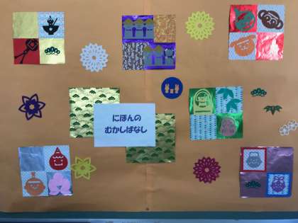 図書室前は、「にほんのむかしばなし」と題して、様々な昔話の絵を切り絵で飾ってくださっています。