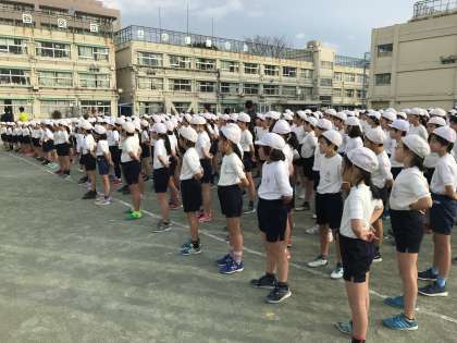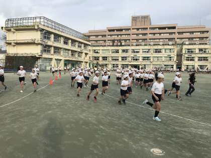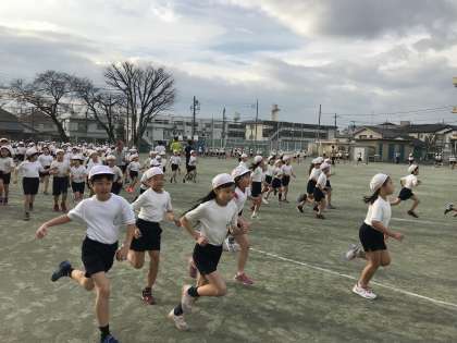 17日(水)は2・4・6年生、18日(木)は1・3・5年生が校庭に集合し、体育朝会を行いました。3つのコースに分かれ、3分間走り続けることを目標にスタートラインに立ちました。