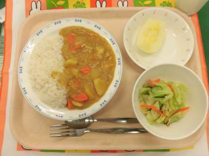 今日は、「カレーライス」のクイズを出したいと思います。今日の給食のカレーライスには、じゃがいもを何個使ったでしょうか?