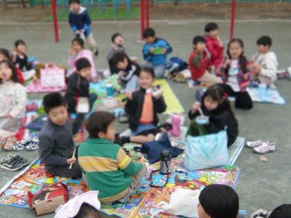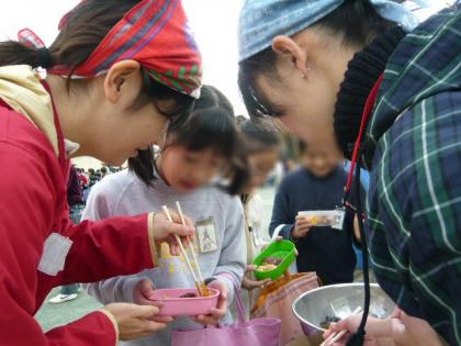 持ってきたお弁当箱についたもちを詰めてもらいます。あんころもち、きなこもち、みたらしです。教室や校庭でおいしく食べました。