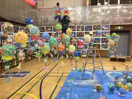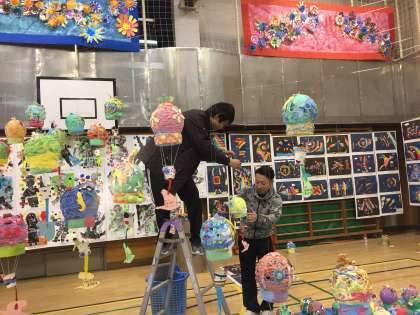 展示方法では、子供たちが素敵な気球をつくったからには、空に飛ばしたい!そんな想いから、すべての作品を吊ることになりました。
