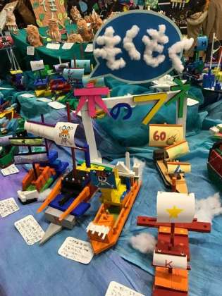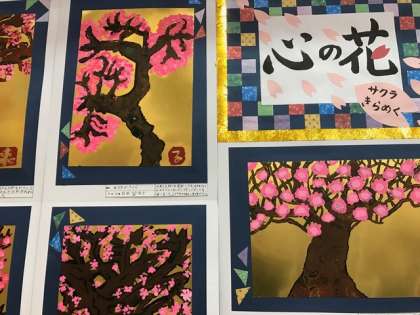 大自然がテーマの4年生。始めに、『もくもく木の船』がお出迎え。のこぎりを使って器用に木を切り、帆をつけました。そんな船がたどり着いた島には『不思議な森の住人』たちがいました。焼き物の作品です。埴輪のようなもの、ドームのようなものなどに白、茶、緑の化粧土で模様を描いたり色をつけたりしました。それを遠くからキラキラと光る動物たちが・・まさか、『新種発見⁉︎』眺めています。この島を彩っています。その彩りの中には桜の花が!一人一人の『心の花』が美しく咲いています。