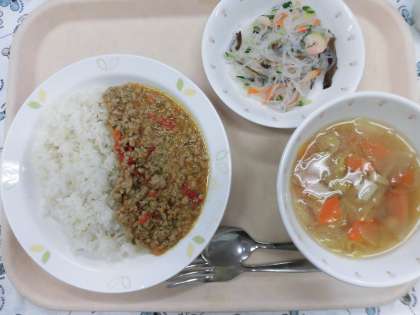 毎月19日は、食育の日です。食育の日には、「給食で世界を飛び回ろう!〜東京オリンピック・パラリンピックに向けて、世界各国の料理に触れよう〜」ということで、いろいろな国の料理を出しています。今日の献立は、「タイ」の料理です。今日は、「ヤムウンセン」のクイズを出したいと思います。ヤムウンセンの「ヤム」は、何を意味するでしょうか?
