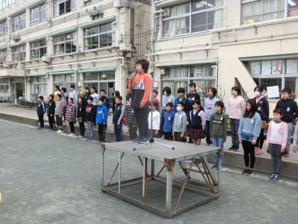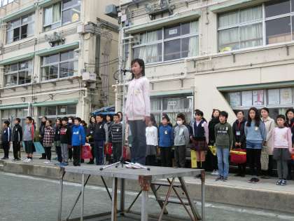 今日は毎年3月に行っている地区班の班旗の引き継ぎを行いました。おもに6年生が班長を1年間務めてきましたが、その班長から次期班長に班旗が手渡されました。この旗には班の子どもたちの安全を守るといった大切な役目がこめられています。そして、新班長となった代表の5年生が今の決意を力強く述べました。来週からは新体制での集団登校となります。班で協力して安全に登校してもらいたいです。