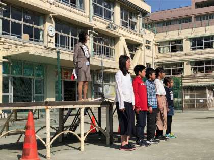 用賀小学校では、6年生が全校児童に呼びかけ、校長先生と朝のあいさつをします。今日は、初めてのあいさつに少し緊張した様子でしたが、今後の活躍を思わせる立派な姿を見せてくれました。